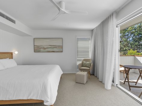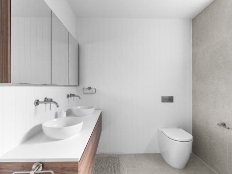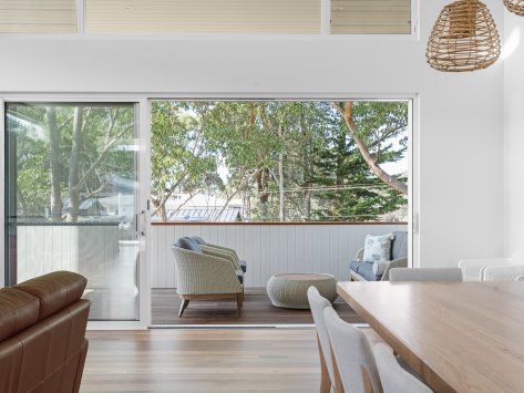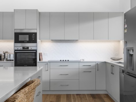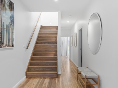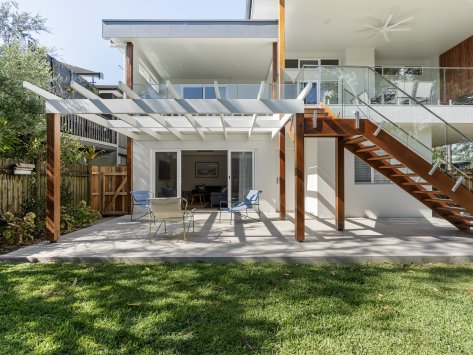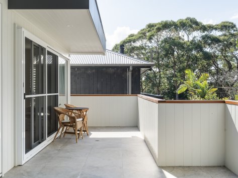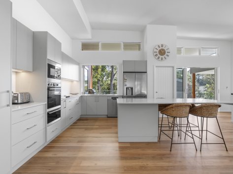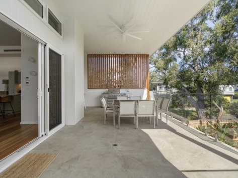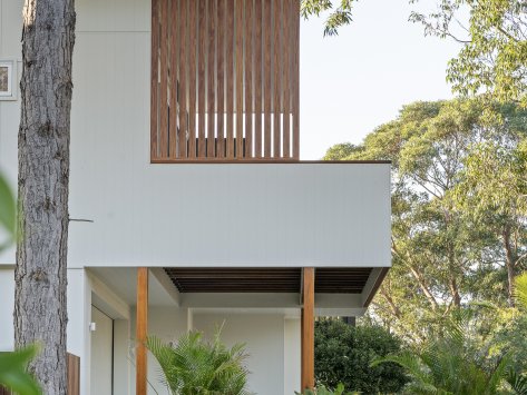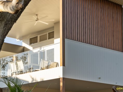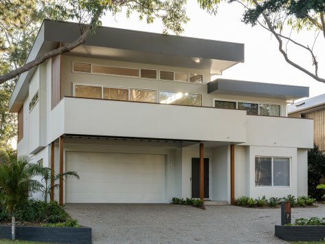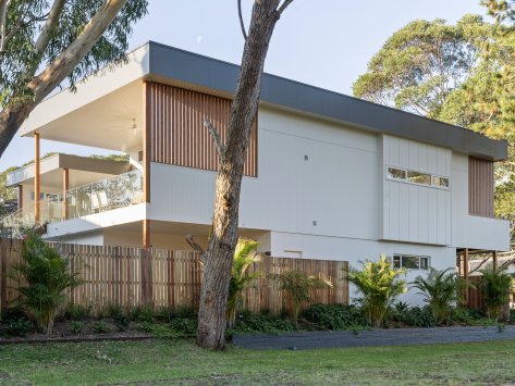 Nestled among the coastal treescape, this contemporary home showcases clean architectural lines and refined material selections crafted in collaboration with 'Milton Drafting & Design'. The exterior combines crisp cladding with warm vertical timber detailing, creating a striking yet welcoming façade. Expansive upper-level balconies capture natural light and offer seamless indoor–outdoor living, while custom fencing and lush landscaping enhance privacy and soften the modern structure.