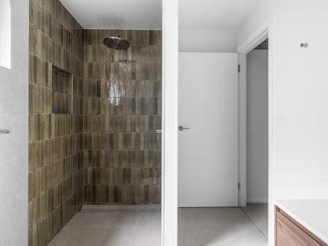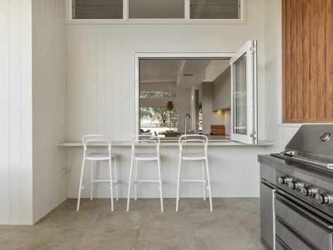 Inside, the home centres around functionality and flow. A servery window connects the kitchen to the outdoor entertaining area, making hosting effortless. The alfresco space features a premium built-in BBQ, durable finishes, and generous seating—perfect for long summer afternoons. Large windows and thoughtfully placed openings frame views of the surrounding greenery, bringing the outdoors in.